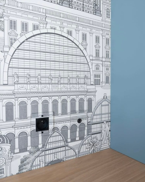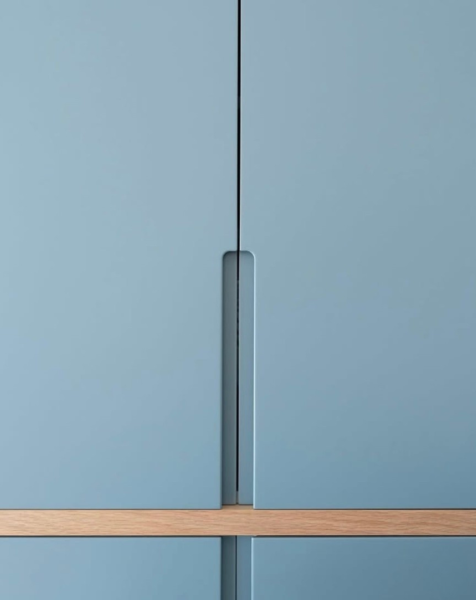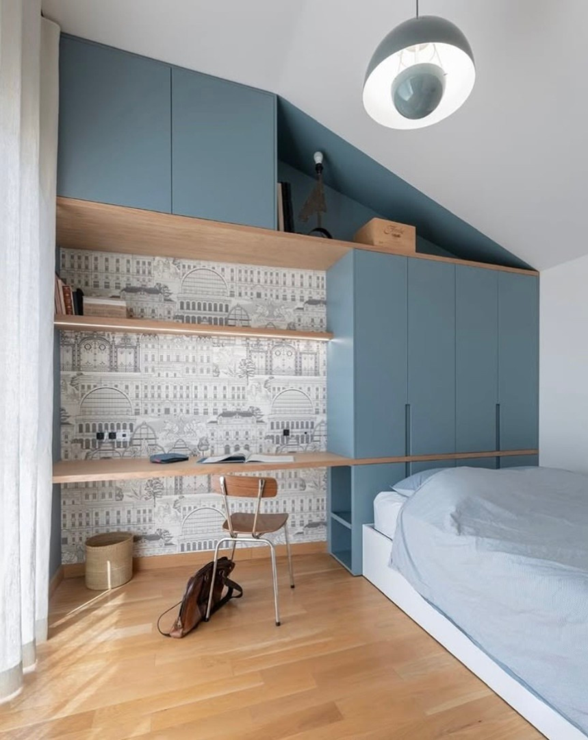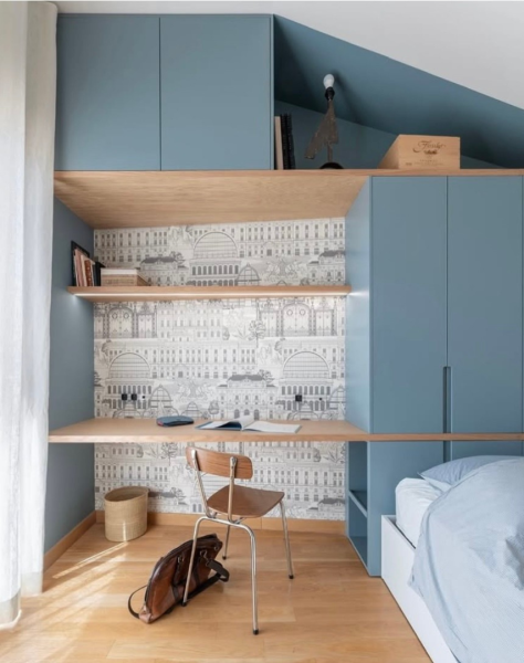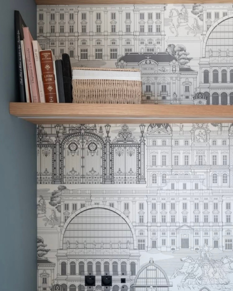 Le mobilier sur mesure en bois, associé à des touches de bleu clair, se combine à une décoration soignée et à un papier peint panoramique évoquant les monuments emblématiques de Lyon, afin de créer un espace à la fois fonctionnel, accueillant et plein de caractère.