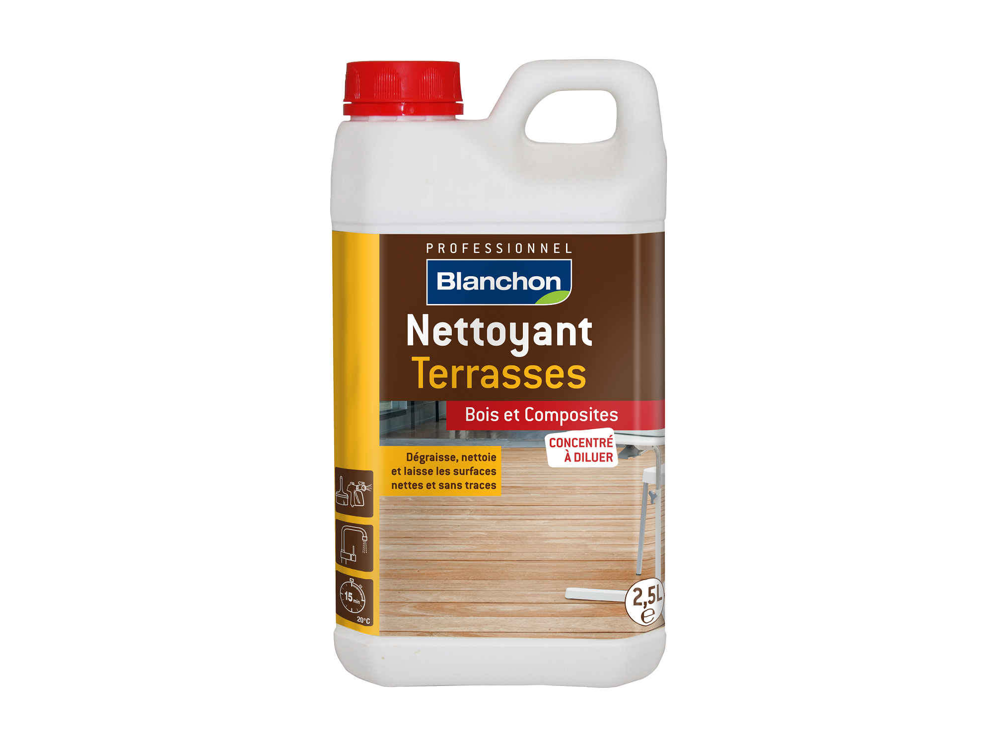 Le nettoyant terrasse Blanchon est un produit concentré à diluer (2,5 L) spécialement formulé pour le nettoyage des bois extérieurs (autoclaves, bois exotiques, résineux…) et matériaux composites. Il agit efficacement pour dégraisser, éliminer les salissures, les dépôts verts et autres traces dues aux intempéries, tout en respectant les fibres du bois.
