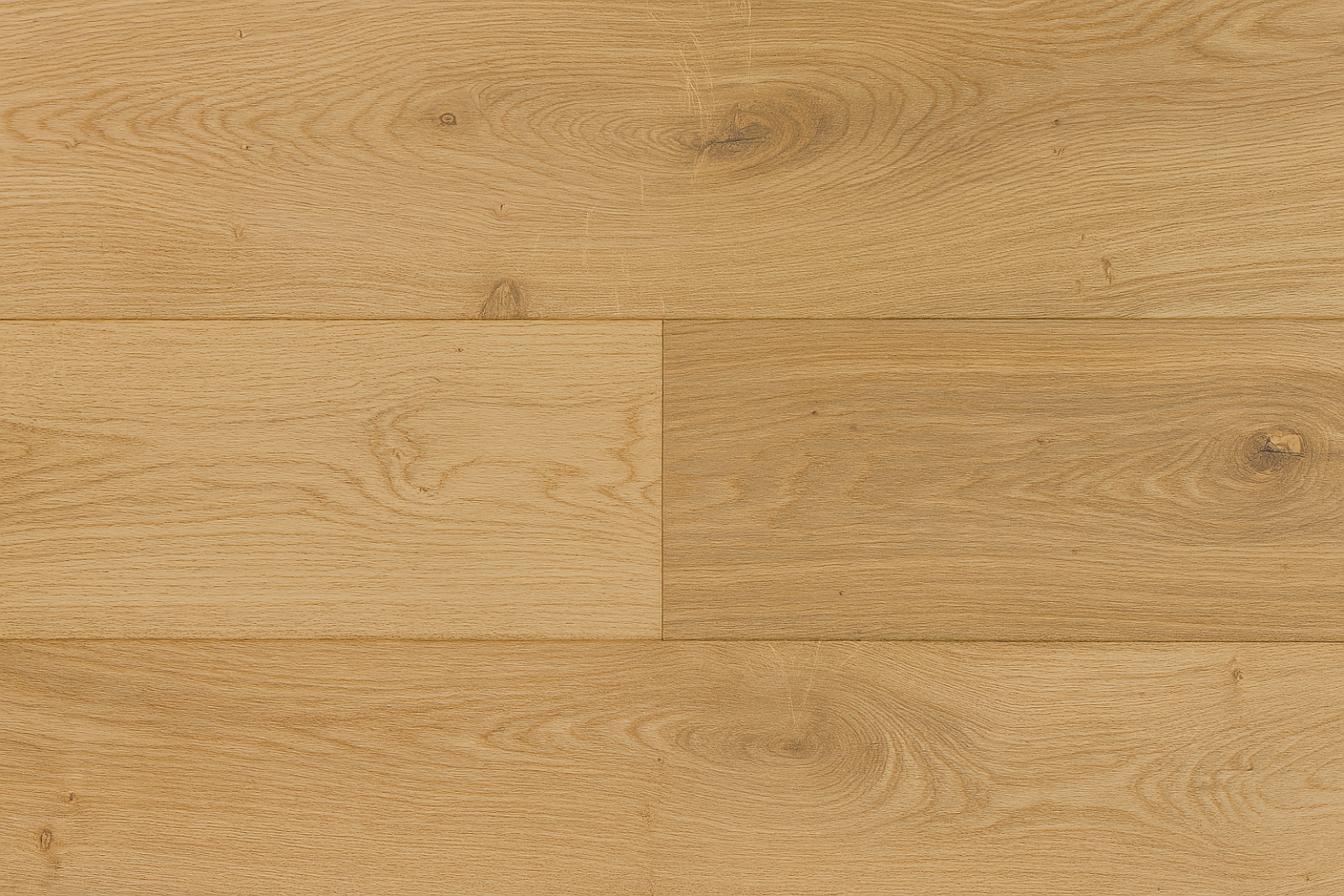 Avec ses lames de 125 mm de large, ce parquet trouve sa place aussi bien dans les petites pièces que dans les grands espaces. Son brossage léger met en valeur la texture du bois sans excès, et son vernis mat naturel offre un rendu sobre et élégant, proche du bois brut, tout en étant facile d’entretien.