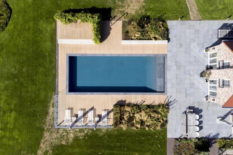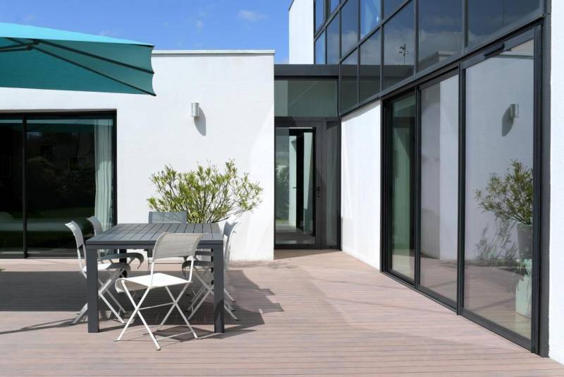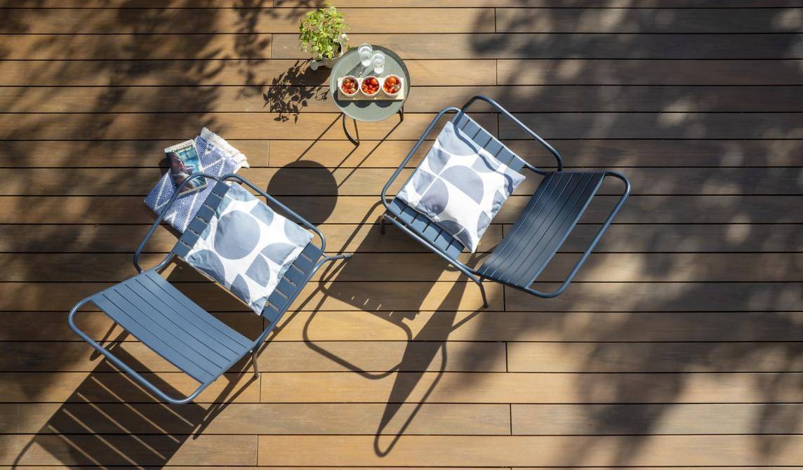 Ses teintes modernes (gris, brun, sable…) permettent de concevoir des terrasses épurées, actuelles, et durables.